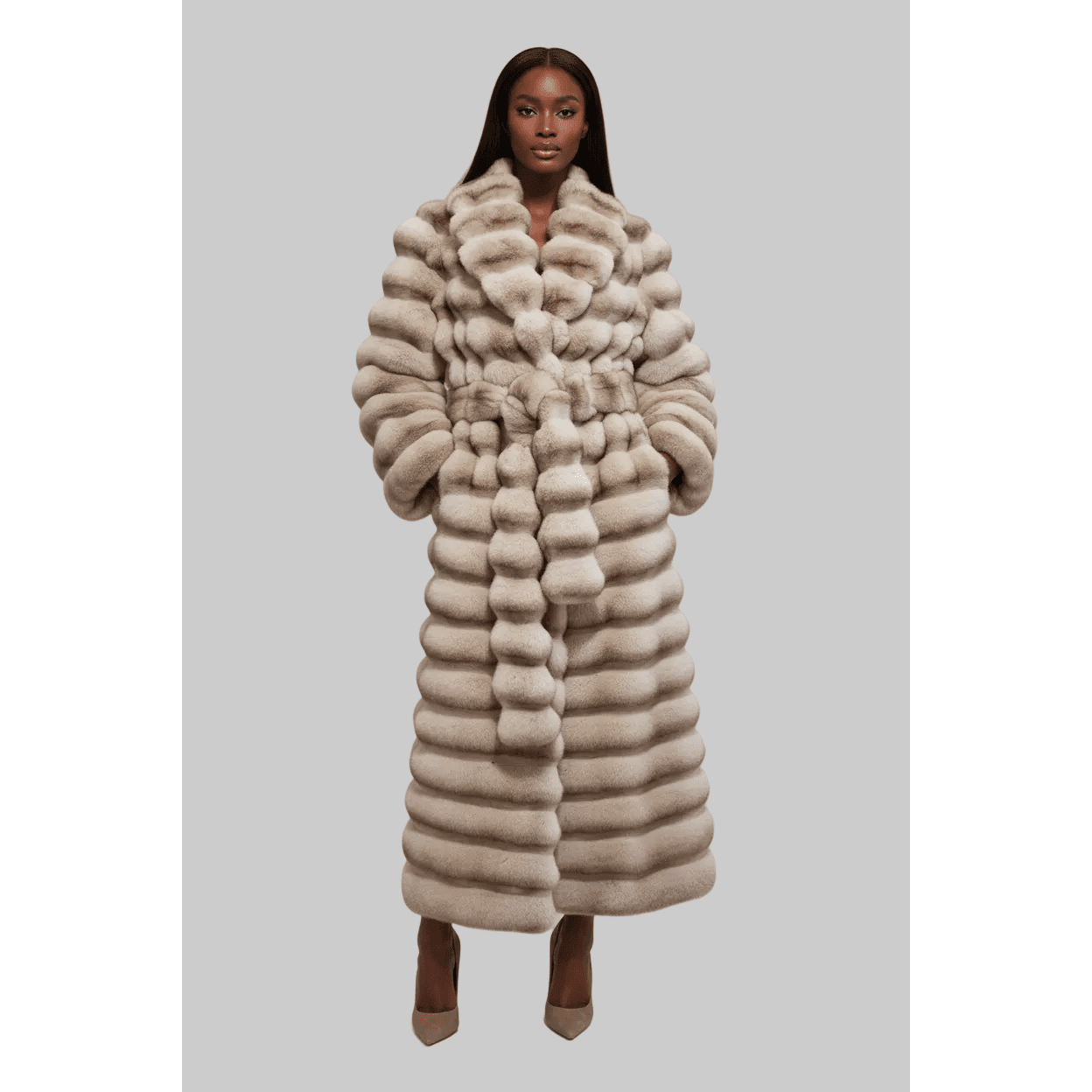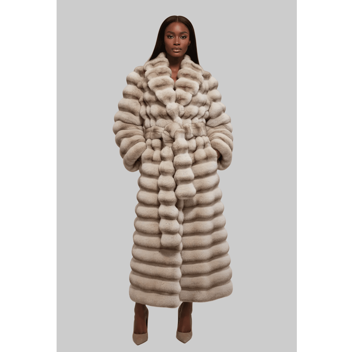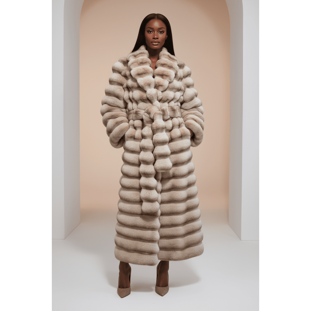 FRANCE Khaki Striped Fluffy Faux Fur Belt Coat
