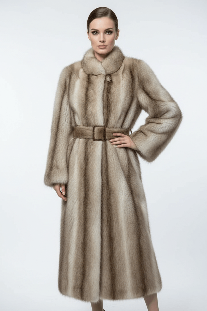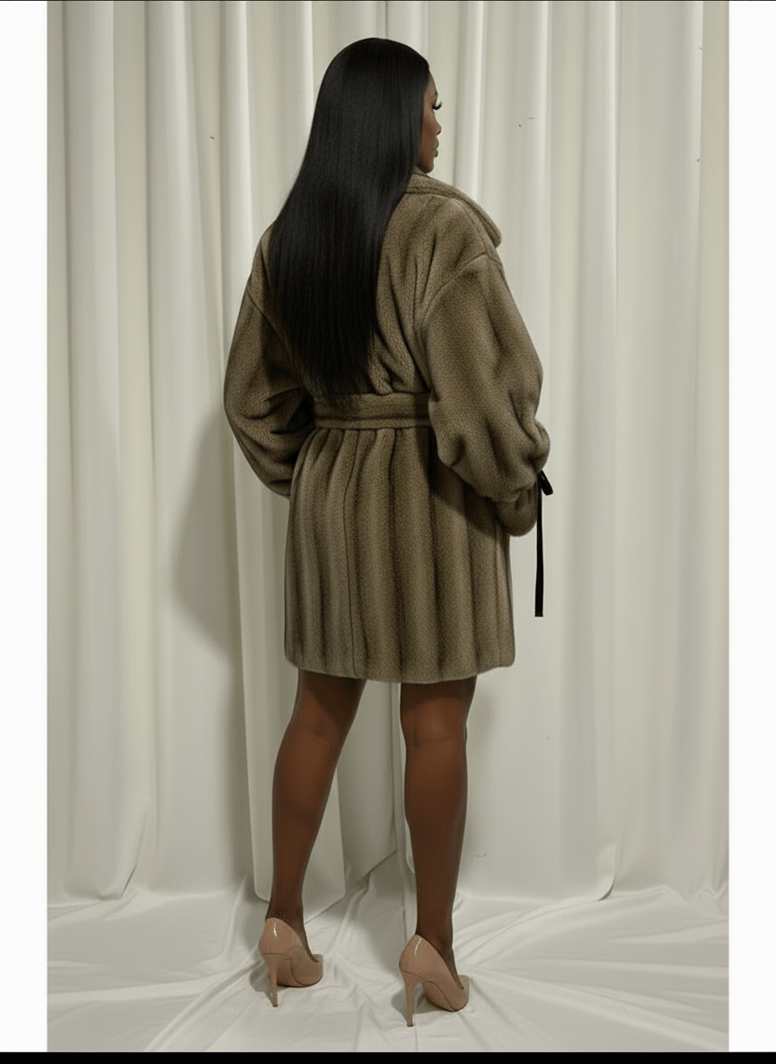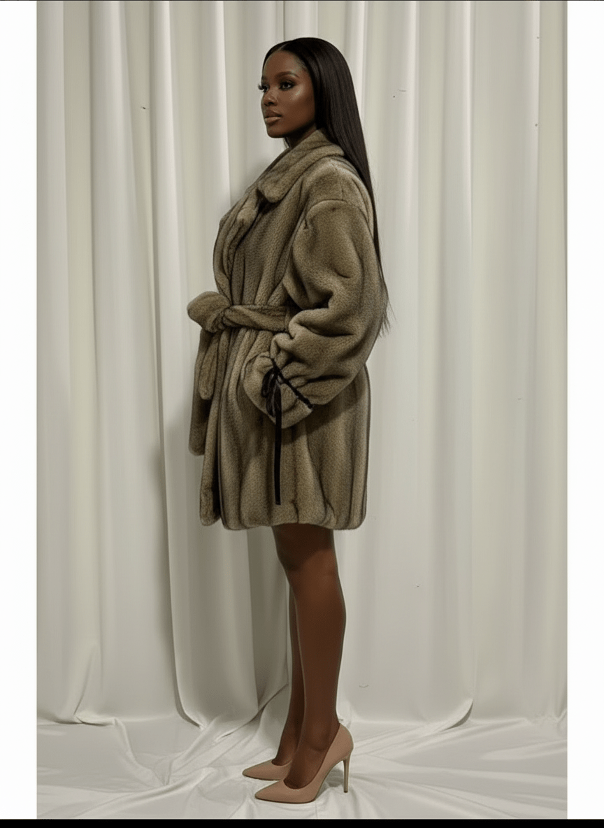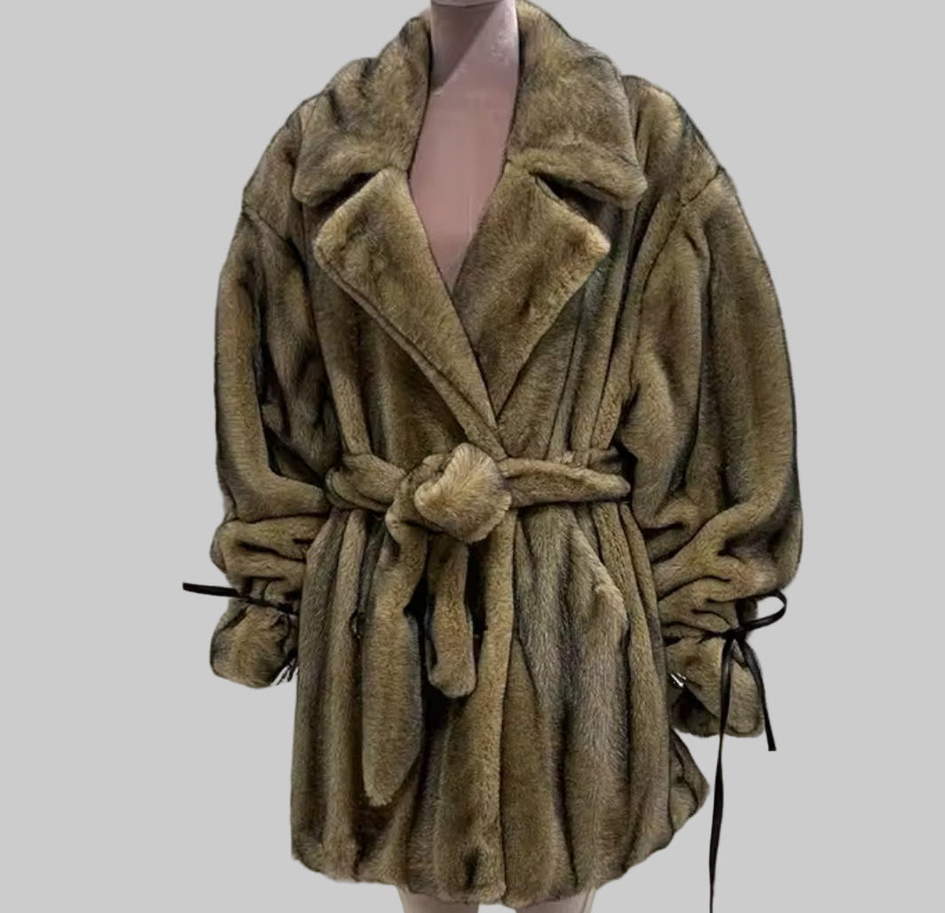 MONACO Brown Luxurious Faux Mink Fur Coat With Leather Belt